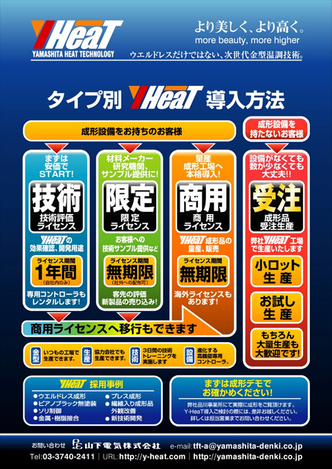 | A | 他の金型に関わる特許ライセンスは、金型の製作会社が指定されていて、自社で製作することさえ許されないことが多いようです。Y-HeaTは、ものづくりのし易さを考慮して、金型製作に縛りを設けていません。自社でもお付き合いの長い下請会社でも製作可能です。 |